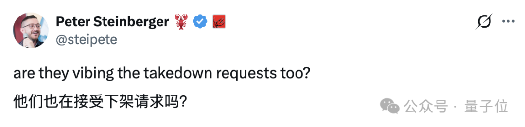 高强度吃瓜的龙虾之父Peter随即赶到了案发现场,调侃Anthropic这些下架请求都是Vibe Coding出来的自动删除程序。