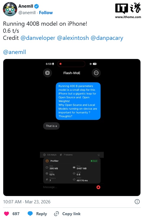 IT之家 3 月 23 日消息,拥有 4000 亿参数的大语言模型只能在配备大容量内存、性能强劲的硬件上运行,因为即使是量化或压缩版本,也至少需要 200GB 内存。从这些苛刻的配置要求来看,iPhone 17 Pro 绝对不会是运行 4000 亿参数大模型的首选,但有人已经证明,苹果这一代旗舰机型完成了这件看似不可能的事。不过IT之家需要说明的是,这离不开一些巧妙的技术手段。