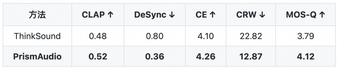 我们做了严格的测试,在传统的 VGGSound 测试集上,PrismAudio 全面超越了现有最好方法:
