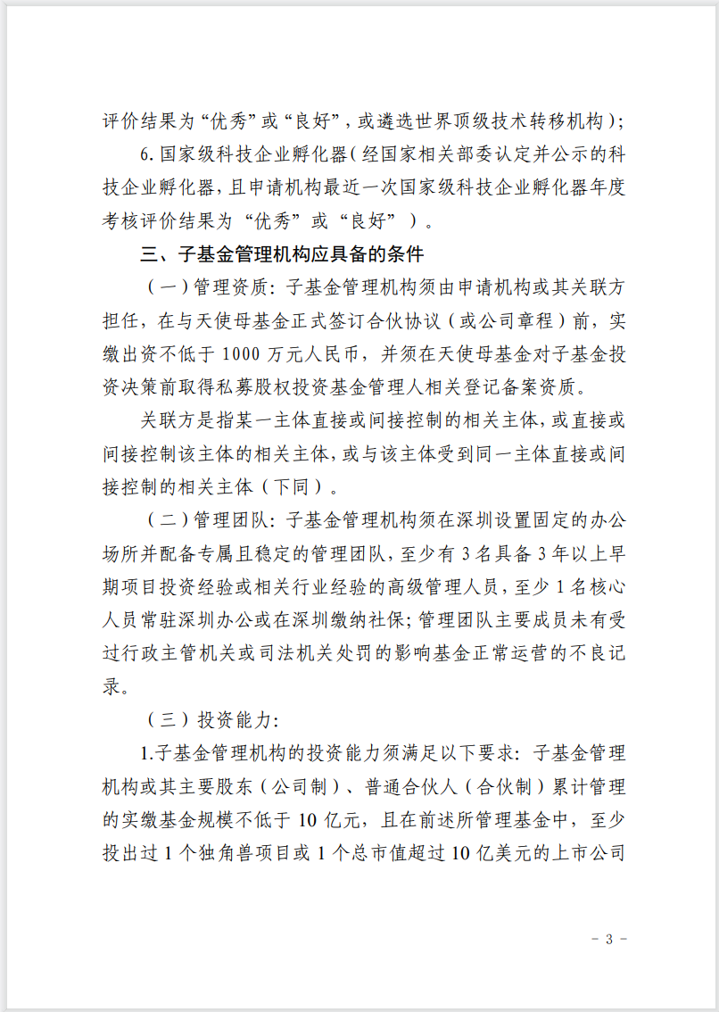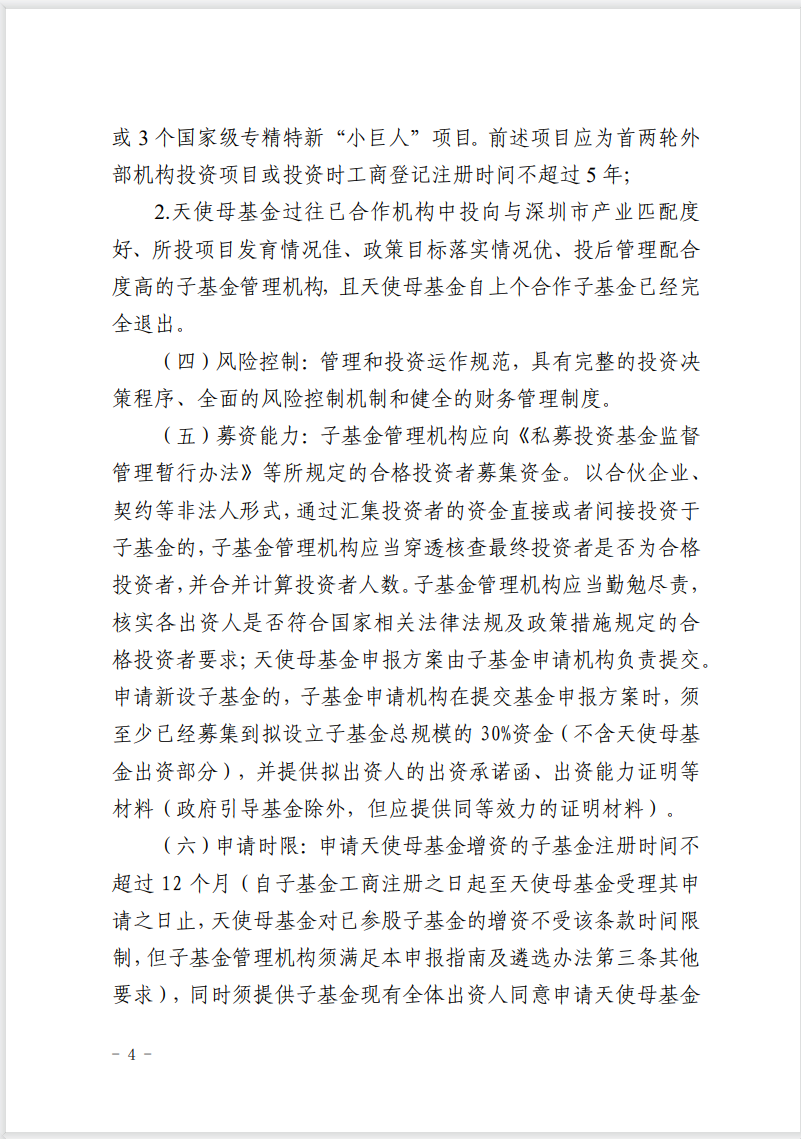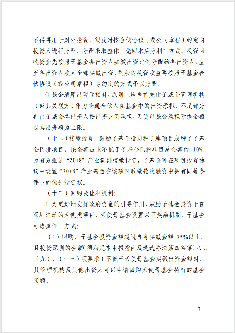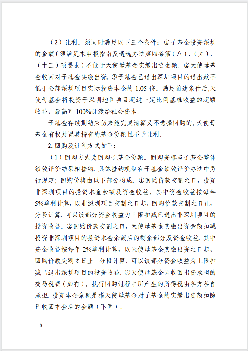 3月26日,深天使正式发布《深圳市天使投资引导基金申报指南及遴选办法,投资总额超过90亿元。但自2024年4月以来,深圳天使母基金未再开展参股子基金遴选,本次新版的发布,既是对近两年相关政策文件的响应,也释放了后续继续出资的积极信号。通过对比2026年版与2020年版,我们发现深天使在放宽准入、优化返投、拉长周期、强化绩效等多个维度协同发力,既降低了优质机构的合作门槛,又更精准地引导资本投向早期硬科技。以下6点,是新旧两个版本的差异之处,当然也可看做是政府投资基金发展的趋势信号。01.取消GP落地硬约束旧版办法中,除了头部机构外,管理机构原则上必须在深圳注册。新版取消了这一限制,仅要求子基金原则上注册在深圳,且管理机构只需在深圳设置固定办公场所及核心人员常驻(缴纳社保)即可。这一调整,降低了机构在深展业的成本,也顺应了近年来的政策趋势——不再执着于把机构锁在深圳,而是更看重人才和项目能不能真正落地。02.投资能力增加投中独角兽与小巨人指标新版对投资能力的认定进行了升级。不仅考察管理规模,而且明确要求至少投出过1个独角兽、或1个10亿美元市值公司、或3个国家级专精特新“小巨人”。这意味着,深圳天使母基金对业绩要求的更高,更倾向于将资金交给有过成功挖掘战新产业中明星企业的团队。 03.延长存续期与新增接续投资早期硬科技创业周期长、投入大,深天使母基金也针对这一特点做了调整。存续期延长:新版将存续期从10年延长至15年,给底层技术更多成长时间,也顺应了耐心资本的方向。接续投资:新增了接续投资要求,鼓励子基金拿出不低于10%的金额投向种子库或种子子基金已投的项目。同时,通过设置“20+8”产业基金在后续轮融资的优先投资权,打通了“种子-天使-成长期”的资本接力棒。04.返投松绑新版弱化了返投条款,并且不再强制要求1.75倍返投。明确只要投资深圳的金额不低于天使母基金的实缴出资,即有机会申请回购或让利。这里的回购是指回购子基金份额。“子基金投资金额超过自身实缴金额75%以上,且投资深圳的金额不低于天使母基金实缴出资金额时,其管理机构及其他出资人可以申请回购天使母基金持有的基金份额。”05.激励机制的精细化与绩效挂钩新版完善了回购与让利机制。虽然延续了最高100%让渡超额收益的政策,但明确规定回购价格和让利资格必须与绩效评价结果挂钩。同时,新版细化了回购价格的构成,对投资非深圳项目和深圳项目的资金收益分别按5%和2%的单利计算。06.探索循环运作机制旧版未明确天使母基金可循环运作,新版新增“未尽事宜参照《深圳市天使投资引导基金循环投资方案》执行”,这意味着深天使母基金可实现资金的再循环出资,为长期陪伴硬科技企业成长提供了更坚实的制度保障。投中嘉川做过统计,2025年新增或修订的政府投资基金管理办法中,明确允许资金滚动使用的占比为57%,未做明确说明的占比为31%,另有12%的政府投资基金明确不允许如此操作。比如部分地方的管理办法是,“对于归属政府的投资收益、利息、退出的本金等,不得滚动使用,由引导基金按照财政国库管理制度有关规定及时足额上缴国库。”所以,目前在滚动投资机制方面,政府投资基金依然在探索与发展阶段。深天使在文件中明确提到这一点,也体现了多数地方逐步注重财政资金循环放大效应。随着循环运作机制的建立与耐心资本制度的完善,深圳天使母基金也望在早期科技创新培育中发挥更持续的牵引作用。更重要的是,深天使的遴选文件也代表了一级市场的发展趋势。很显然,国资LP主导一级市场后,正在探索一条兼顾政策要求与市场化效率的新模式。文件原文如下: