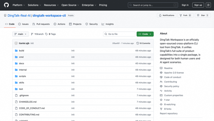 10天后,这套CLI能力正式开始开源,开发者和AI Agent无需了解任何底层API细节,一行指令即可调用企业级功能。目前,钉钉 CLI 开源项目已发布到 Github 社区,搜索“dingtalk-workspace-cli”即可访问,开发者、企业可从项目 README 文档加入官方社群,参与能力共创。