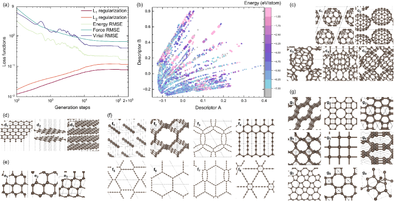 为了让 MLP 具备泛化能力,研究团队构建了一个覆盖极广的训练集,包含从 C₆₀ 富勒烯到一维碳链、二维石墨烯、三维金刚石的各种结构;不同杂化态的混合体系;极端力学状态(从 -400 GPa 的拉伸到超过 1000 GPa 的压缩)。