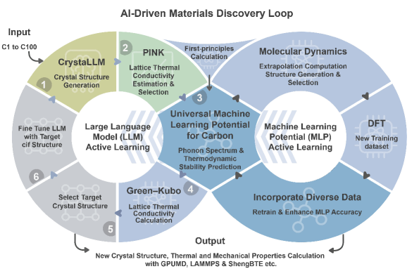 第一循环(生成):利用 CrystaLLM产生候选碳结构(每个晶胞最多 100 个原子)。这些候选结构首先被快速筛选(用 PINK 代码估算热导率、用 Phonopy 结合当前 MLP 评估动力学稳定性)。