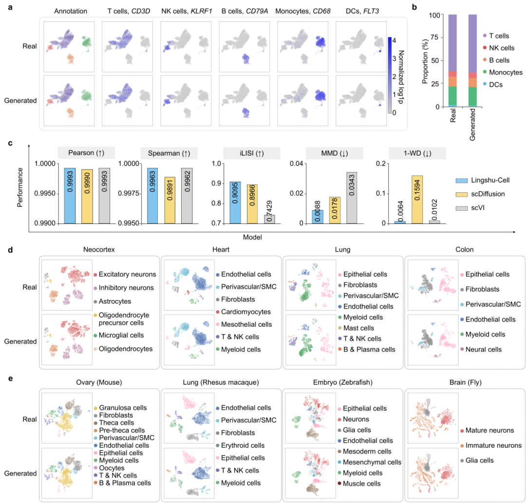 在 PBMC 数据上,生成细胞与真实细胞在 UMAP 中呈现出高度一致的群体结构;各亚型的组成比例也被较好重现,有效避免了传统生成模型中常见的模式崩溃(如过度生成或遗漏特定亚型)问题;marker 基因的空间表达模式同样与真实数据吻合。这说明模型学到的绝不是浅层统计学的相似性,而是具有生物学意义的细胞状态结构。在定量比较中,Lingshu-Cell 在 5 个评估指标上均优于现有基准模型:scDiffusion 和 scVI。这种优异的表现也不仅限于单一数据集:从人类脑组织到果蝇,不同组织和不同物种的数据上都得到了稳定且一致的验证。