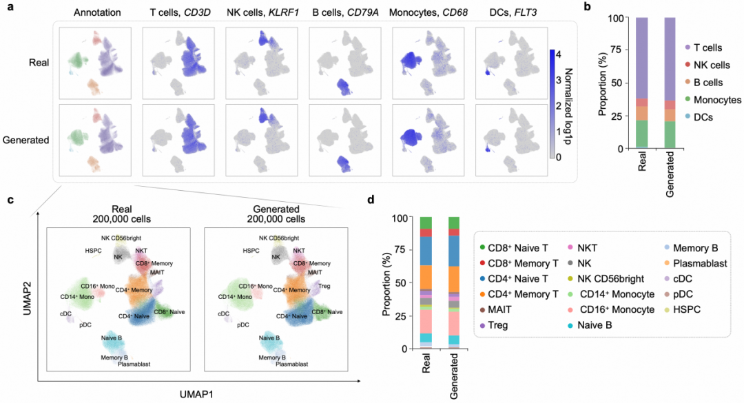 图 5:更大规模细胞群体中的高分辨率细胞状态生成结果。(a)PARSE 10M PBMC 数据中真实细胞与生成细胞的 UMAP 可视化,并按细胞类型注释与 canonical marker 基因表达着色;(b)真实数据与生成数据中主要细胞类型比例对比;(c)在更高分辨率下的 UMAP 可视化,显示生成细胞能够重现真实数据中的细胞亚型结构;(d)真实数据与生成数据中细胞亚型比例对比,显示在更高分辨率下仍保持稳健一致性。