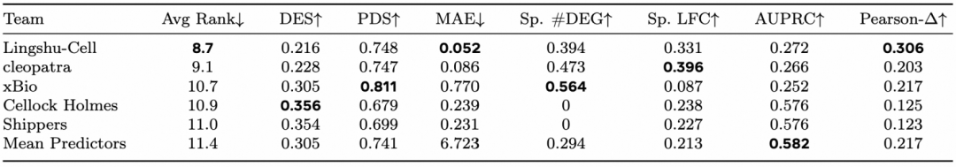 1. 基因扰动响应预测:基因扰动是指通过 CRISPR 等基因编辑技术,特异性地抑制或敲除目标基因的表达,进而观察细胞在该基因受扰动后成千上万个基因的转录表达级联变化,这也是去年虚拟细胞竞赛 (Virtual Cell Challenge) 的核心任务。 VCC 由 Arc Institute 发起、NVIDIA 与 10x Genomics 赞助,是单细胞基因扰动响应预测领域的全球性比赛。我们将 Lingshu-Cell 与 Generalist Rank(综合考核 7 项核心指标)的当前榜单队伍进行了全面对比。Lingshu-Cell 在这个榜单上取得了最优的平均排名,尤其是在 MAE(平均绝对误差)和 Pearson-Δ 两项关键指标上的表现排名第一。这不仅印证了模型卓越的泛化预测能力,更验证了 MDDM 架构对于基因扰动响应预测任务上的巨大潜力。