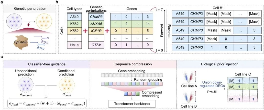 图 3:以基因扰动为例,展示模型框架与关键设计。(a)基因扰动任务示意;(b)输入序列构成与掩码离散扩散过程;(c)三个关键技术:Classifier-free guidance、序列压缩、生物学先验注入。