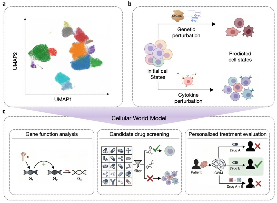 图 2:细胞世界模型核心能力的两个维度,以及潜在应用场景。(a)状态分布建模;(b)扰动响应预测;(c)潜在应用场景,包括基因功能研究、候选药物筛选和个性化治疗评估。