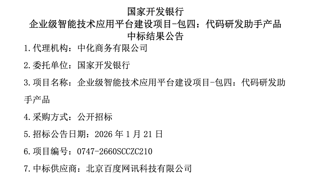 4月3日,国家开发银行企业级智能技术应用平台建设项目-包四:代码研发助手产品采购项目开标,北京百度网讯科技有限公司中标,金额66万元。