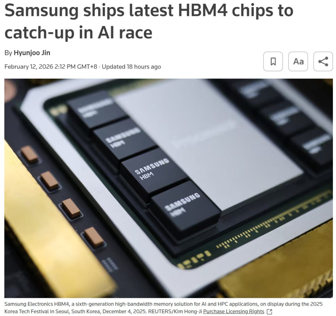 但过去一年里,事情发生了变化。三星押注最新一代的 HBM4 芯片,在 2026 年 2 月正式启动量产。年初的新年致辞中,三星半导体负责人全永铉说了一句让行业记住的话:「关于 HBM4,客户甚至表示——Samsung is back。」