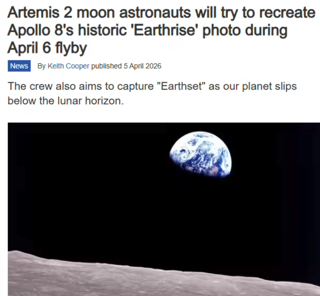 从文中获悉,阿波罗 8 号是首次实现载人绕月的航天任务,时隔 57 年多,阿尔忒弥斯 2 号将于美国当地时间 4 月 6 日(星期一)飞掠月球背面。在绕月飞行过程中,阿尔忒弥斯 2 号宇航员计划重现地出照片,希望这张新照片能像原作一样,起到凝聚人类共识的作用。