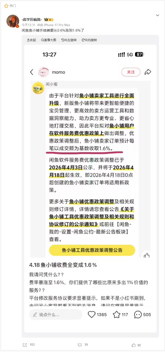 《关于鱼小铺工具优惠政策调整及相关规则和协议修订的公示通知》获悉,此次规则变更于 2026 年 4 月 3 日公示通知,将于 2026 年 4 月 18 日正式生效。软件服务费收费规则补充「鱼小铺工具」;开通「鱼小铺工具」的卖方,其相关交易订单不再享受平台整体交易优惠政策。(来源:IT 之家)