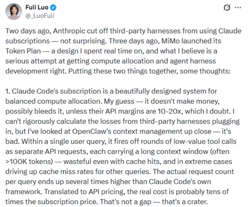 小米大模型负责人罗福莉最近在一篇帖子中分析了这个问题。她认为Claude Code的订阅系统设计精巧,但可能并不赚钱,甚至在亏本——除非Anthropic的API利润率能达到10到20倍,她对此表示怀疑。