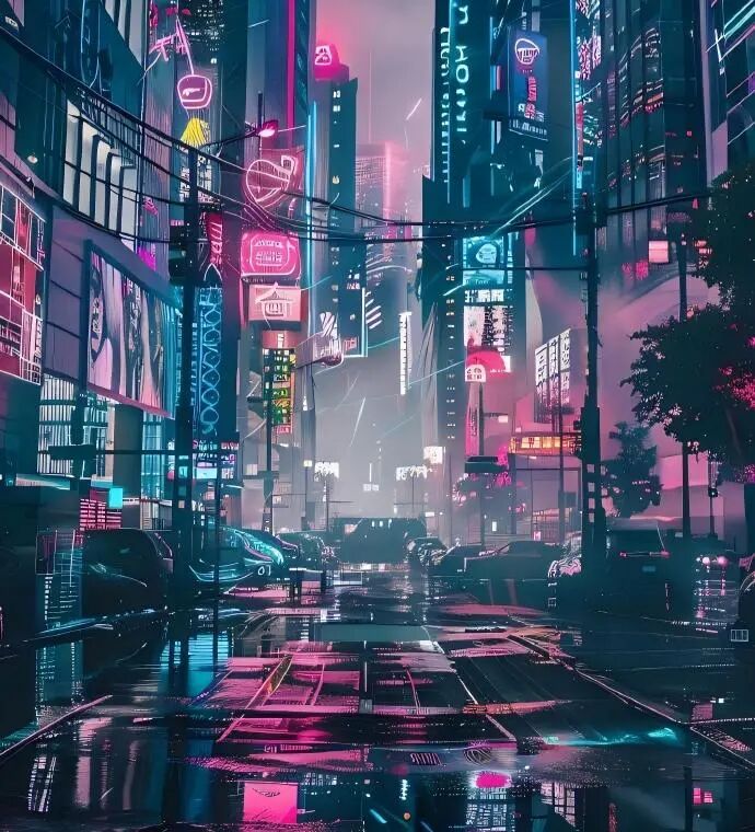 这张图片最有可能属于 **赛博朋克(Cyberpunk)** 风格,同时也融合了 **Synthwave(合成器波)** 和 **霓虹黑色电影(Neon Noir)** 的美学特征。 **1. 核心风格:赛博朋克 (Cyberpunk)** 这是最显著的特征。赛博朋克的核心定义是“高科技,低生活”(High Tech, Low Life),虽然这张图主要展示了“高科技”的一面,但视觉元素完全符合: * **未来都市:** 高耸入云、密密麻麻的摩天大楼,给人一种压迫感和拥挤感。 * **霓虹灯光:** 画面充满了高饱和度的霓虹灯招牌、全息投影广告。 * **反乌托邦氛围:** 街道显得阴暗、潮湿,有一种混乱但有序的科技感。 **2. 配色方案:Synthwave / Retrowave (合成器波/复古波)** * **标志性配色:** 图片大量使用了 **青色 (Cyan/Teal)** 和 **洋红色/粉色(Magenta/Pink)** 的对比。这是80年代复古未来主义(Retrowave)和合成器波音乐的典型视觉配色。 * **发光效果:** 这种高亮、辉光(Glow)的处理方式,让人联想到80年代对未来的想象。 **3. 氛围营造:Neon Noir (霓虹黑色电影)** * **雨夜与反射:** 地面是湿滑的,倒映着五光十色的灯光。这种“雨夜+霓虹灯”的组合是黑色电影(Film Noir)在科幻题材中的演变,强调了一种神秘、忧郁和孤独的氛围。 * **雾气/朦胧感:** 远处的建筑消失在雾气中,增加了画面的深度和神秘感。