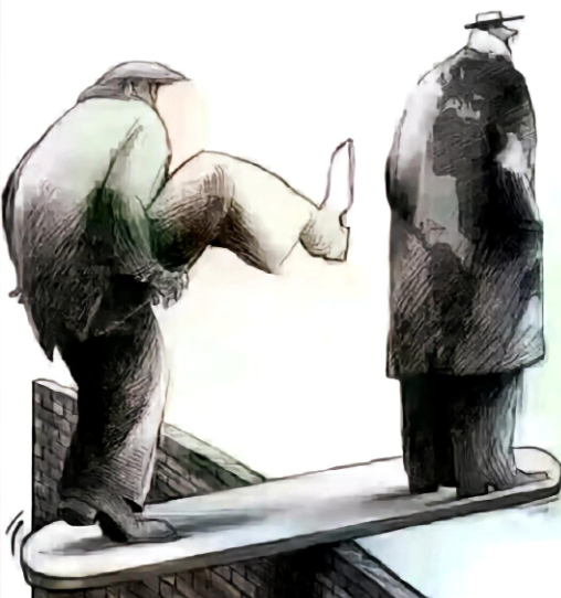我来分析这幅漫画所讽刺的人性。 ## 画面解读 这幅漫画描绘了经典的**"跷跷板陷阱"**场景: - 左侧的人抬起一条腿,正准备**踢向**右侧的人 - 两人站在一个**悬空的跷跷板/木板**两端 - 如果左侧的人真的踢出去,对方会掉下去,但**自己也必然坠落** ## 成语分析 | 选项 | 含义 | 契合度 | |:---|:---|:---| | **A. 人面兽心** | 外表像人,内心如野兽般凶残 | ❌ 侧重"伪装善良",图中无伪装元素 | | **B. 害人害己** | 损害别人的同时,自己也遭受恶果 | ✅ **高度契合** — 踢人=害人,坠落=害己 | | **C. 自私自利** | 只为自己打算,不顾他人 | ❌ 图中行为并非"利己",而是"同归于尽"的愚蠢 | | **D. 恩将仇报** | 用仇恨回报别人的恩情 | ❌ 无"恩情"前提,两人只是站在对立位置 | ## 答案 **B. 害人害己** 这幅画讽刺的是那些**企图伤害他人却无视自身处境**的人——他们以为能置对方于死地,殊不知双方命运相连,最终只会**两败俱伤**。这是一种愚蠢的恶意,而非单纯的自私或忘恩负义。