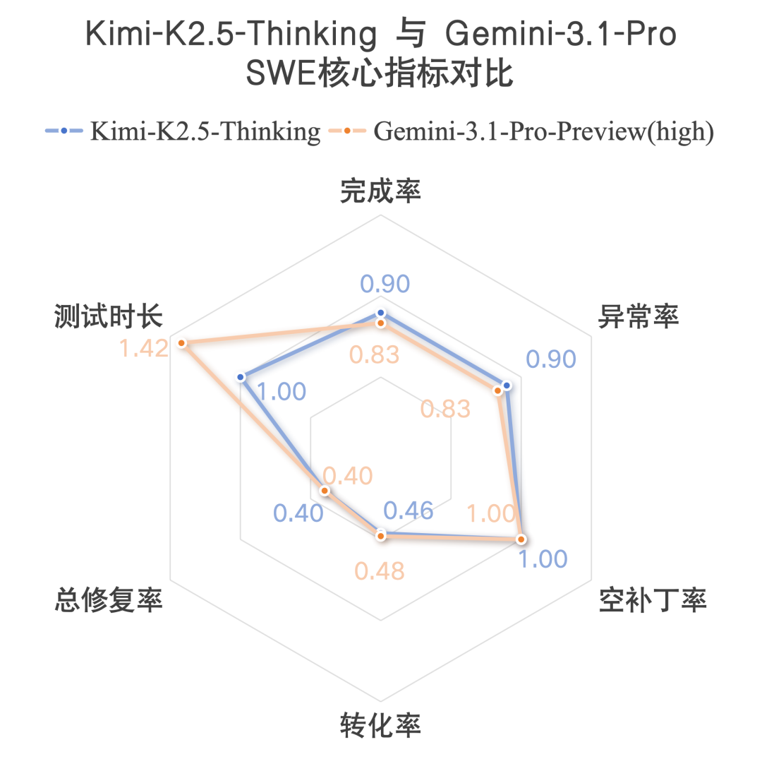 整体来看,二者核心性能差距十分微弱。在工程修复能力相当的前提下,两款模型在执行效率上存在明显分化:Gemini 单题测试耗时更短,推理与测试链路响应更快;Kimi 耗时相对更长,反映出其在复杂工程场景下的代码解析、测试执行链路仍存在一定优化空间。不过该差异仅体现在耗时维度,并未对最终修复成功率与补丁质量产生影响。 综合而言,两款模型核心指标整体接近,仅在执行效率上差距相对突出。Kimi-K2.5-Thinking 已在核心修复能力上追平国际顶级旗舰 Gemini 3.1 Pro,同时在工程稳定性、任务完成度上更具优势,充分标志着国产头部模型正式跻身国际准旗舰第一方阵。