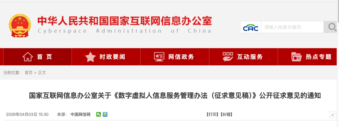 国家互联网信息办公室关于《数字虚拟人信息服务管理办法(征求意见稿)》公开征求意见的通知