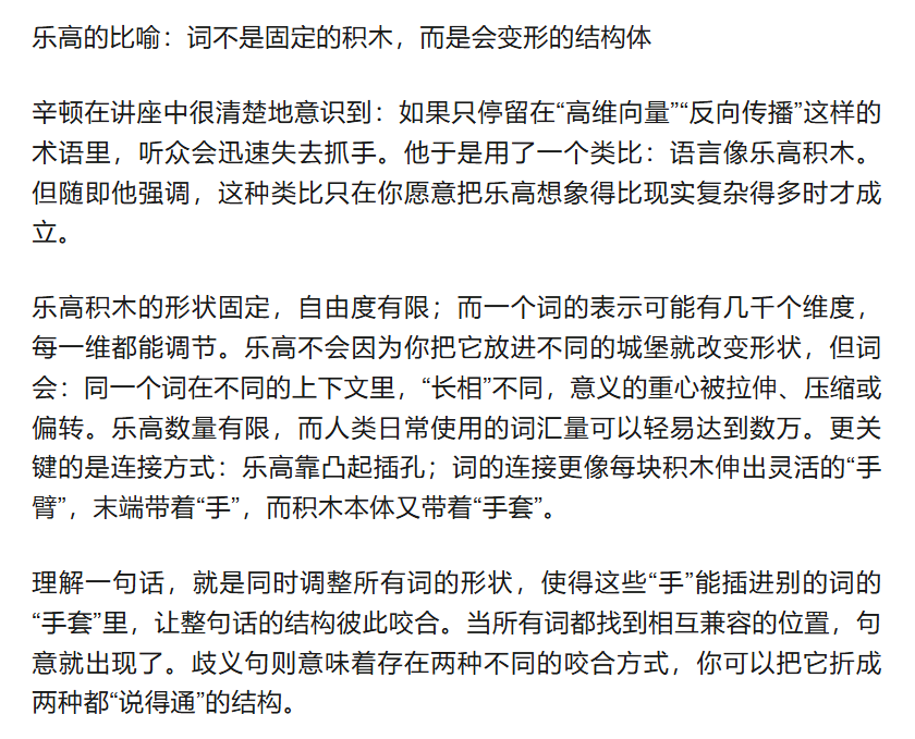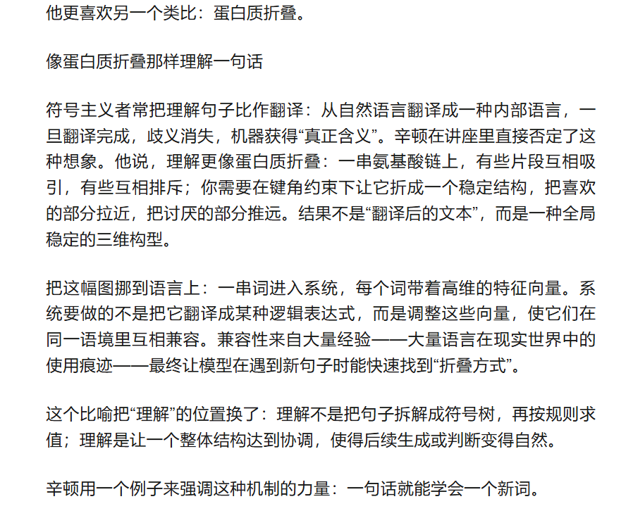 熟悉 Transformer 的人会立刻联想到 query 与 key。辛顿自己也承认这不是一一对应的严格映射,但它给外行一种直觉:意义不是写在某个中心符号表里,而是通过彼此的关系在结构中“成形”。