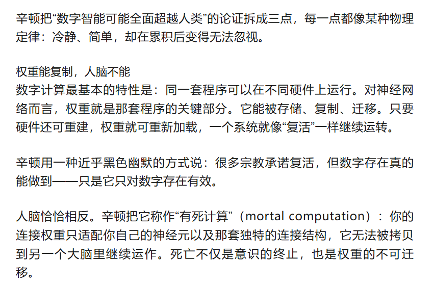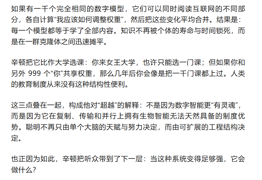 讲到这里,辛顿做了一个微妙的转折:他并没有把胜利归结为“神经网络赢了符号主义”,而是把它当作下一层推演的地基——既然语言理解可以通过这种可复制的权重结构实现,那么数字智能在结构上就拥有某些人脑没有的优势。