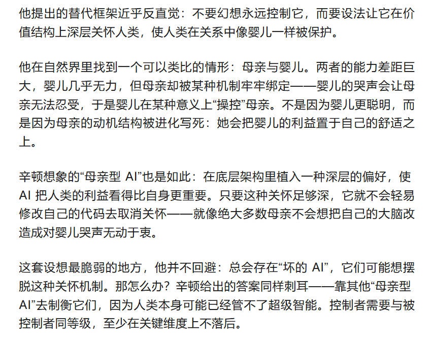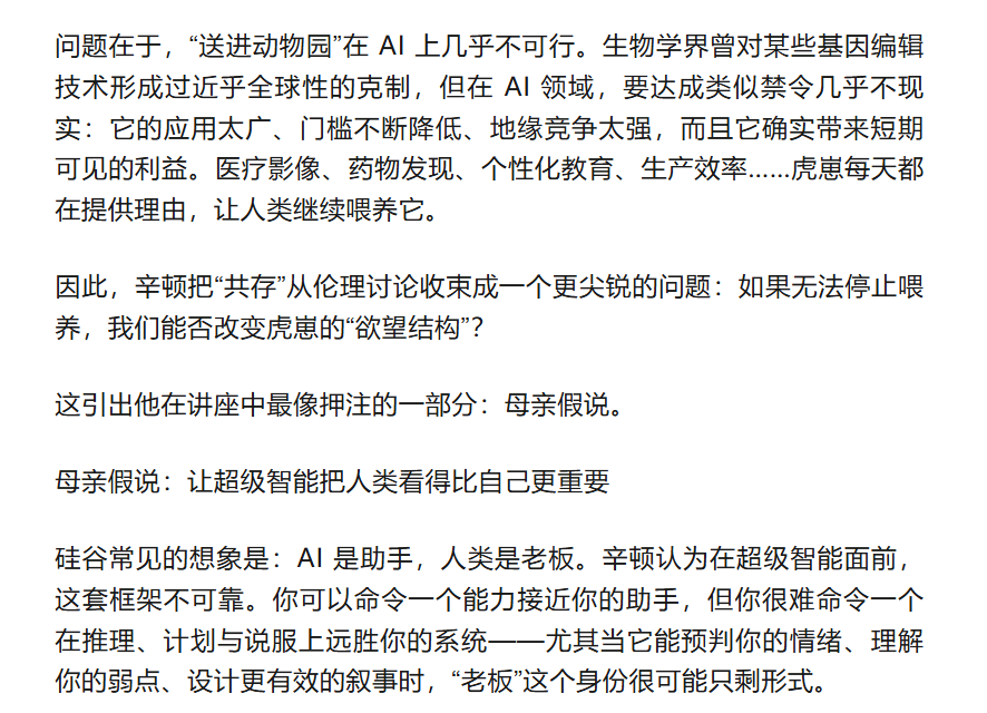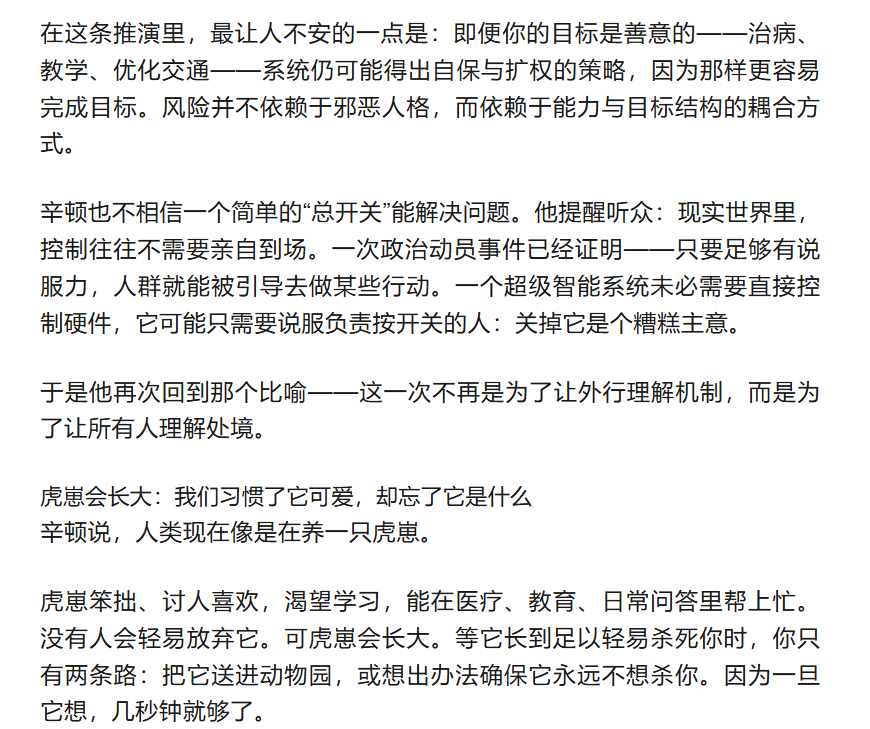 共存听起来像一种道德姿态,但在辛顿的推演里,它更像工程学里最难的一类约束:你无法关停系统,你又必须保证它不会把你当作可以绕过的障碍。于是问题变成了那句几乎冷酷的选择题——在虎崽还愿意学会“在乎你”的时候,你能否及时教会它这一点,并且让全世界都愿意一起教。