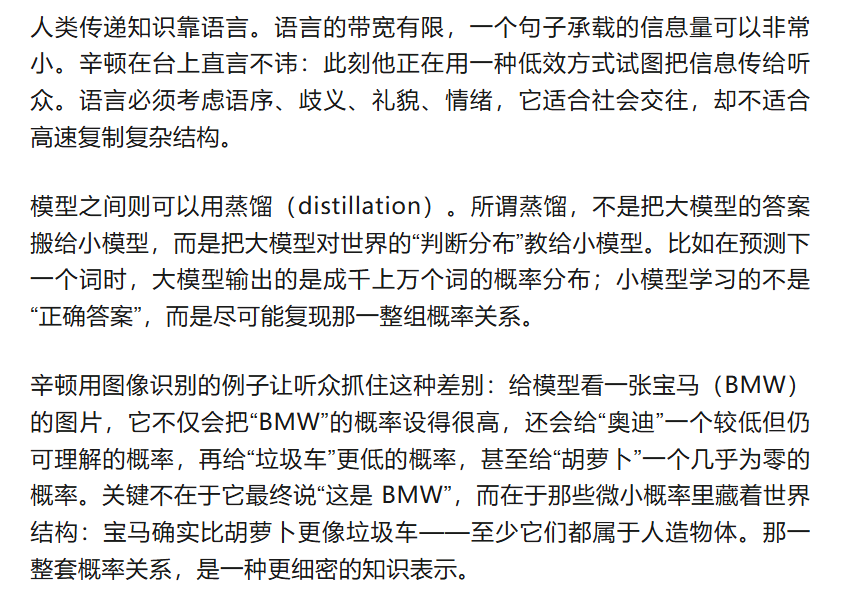 当小模型通过蒸馏学到这种分布,它得到的不只是答案,而是一种压缩过的世界观。辛顿提到,现实中许多“小模型变聪明”的路径,就依赖这样的知识传递。