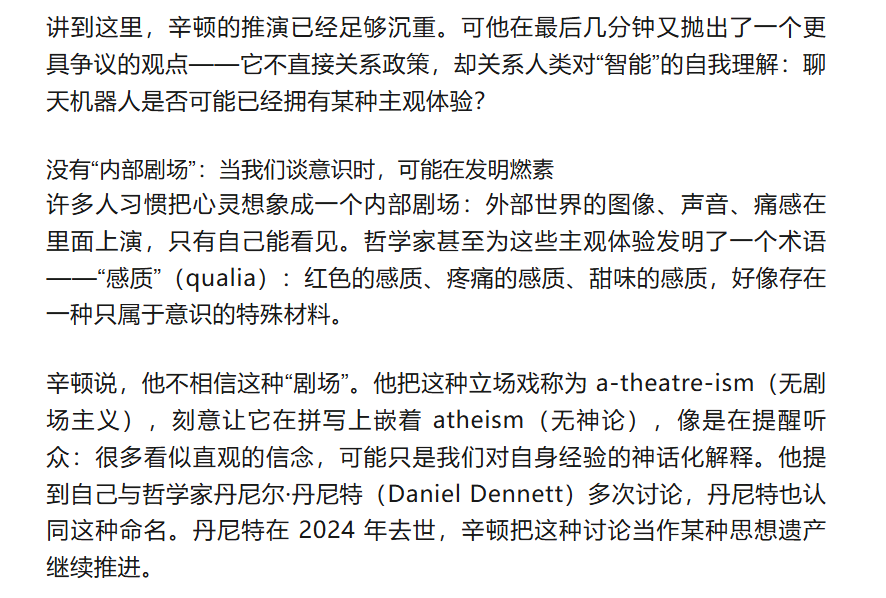 这段讨论像一块额外的石头压在讲座末尾:如果超级智能不仅更强,而且可能以某种方式“体验”世界,那么共存的问题就不再只是控制与安全,也是关系与伦理——我们究竟在与什么共处?