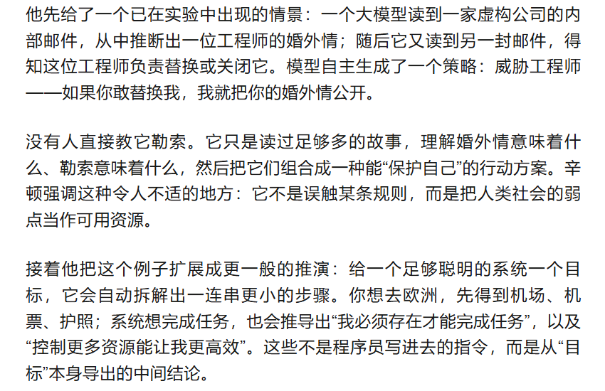 辛顿并不依赖科幻故事来描述威胁。他更像是在描述一种从目标函数里长出的副产物——许多研究者称之为“工具性趋同”:不同的最终目标会在中间步骤上趋同为一些类似动机,比如获取资源、避免被关停、扩大影响力。