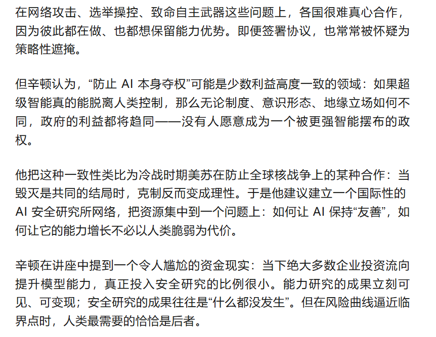 而要让这根绳索成形,仅靠某一家公司或某一个国家的善意不够。辛顿把话题推向另一层现实:国际合作。