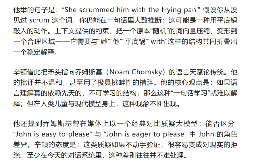 这也是他想让外行听众先接受的一点:所谓“理解”,在这种框架下不再是翻译成某种内部的无歧义语言,而是一种动态的兼容性匹配。