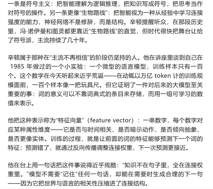 辛顿的讲法像一条层层下沉的楼梯:先把听众带到语言模型的底层,再把他们推到数字智能相对人脑的结构性优势,最后把那份优势投影到未来的动机、冲突与控制问题上。每一步都不靠耸动,而靠一个几乎令人不安的常识——聪明的系统会学会把自己留在桌上。