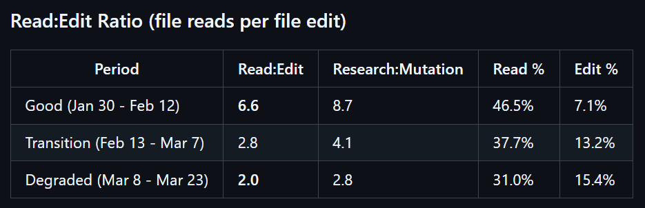 并且,数据表明,扩展思考 token 并非 “锦上添花” 的功能,而是模型完成多步骤研究、遵循规范、审慎修改代码所必需的结构性要素。当思考深度被削减时,模型的工具使用模式会出现可测量的转变,从 “优先研究” 转向 “优先编辑”,进而引发用户反馈的各类质量问题。