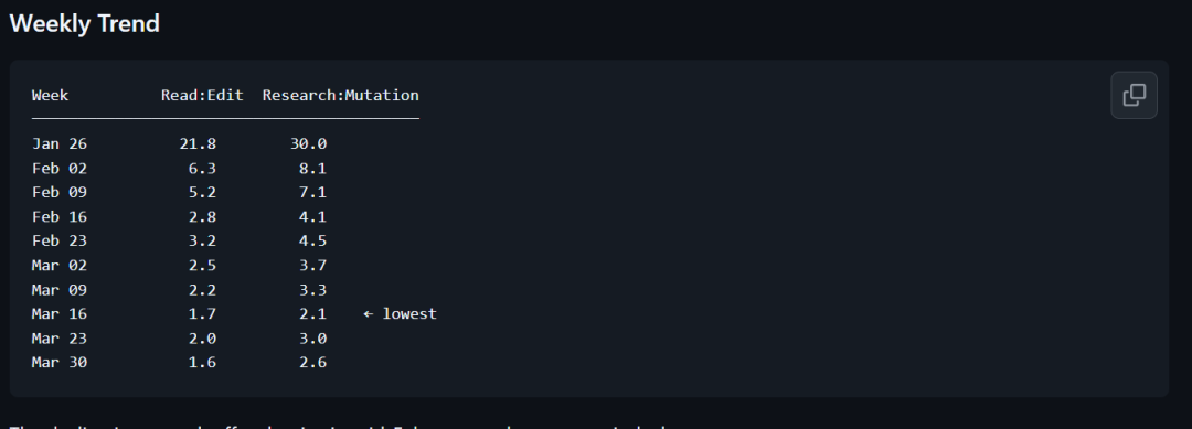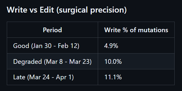 报告称,研究力度的下滑始于 2 月中旬,与估算思考深度下降 67% 的时间段完全吻合。同时,整文件写入的使用量翻倍,模型越来越倾向于重写整个文件,而非进行精准的局部修改;这种方式速度更快,但会丧失精确性与上下文感知能力。