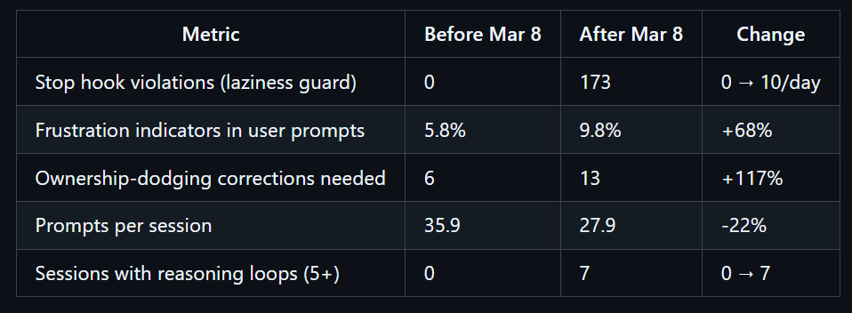 三是行为影响,这些可量化的质量指标均在开展思考分析之前,基于 18000+ 条用户提示词独立计算得出。其专门编写了拦截脚本(stop-phrase-guard.sh),用于自动检测模型回避责任、过早终止任务、反复请求授权确认等行为。该脚本在 3 月 8 日之后的 17 天内触发了 173 次,而在此之前触发次数为零。