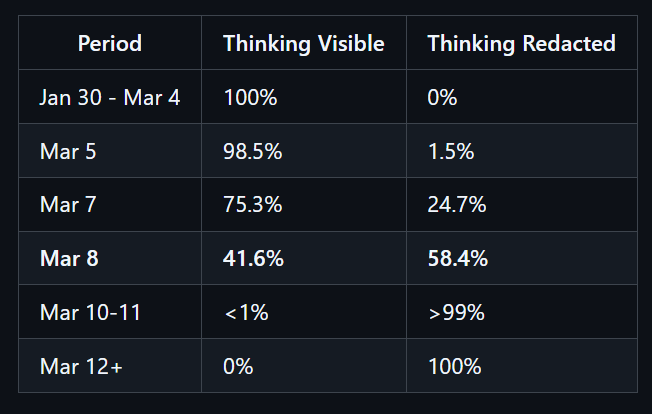 一是思考内容屏蔽时间线与质量下降高度吻合,这基于会话 JSONL 文件中的思考模块分析。此次质量下降问题于 3 月 8 日被独立上报,而这一天恰好是 redacted thinking 占比突破 50% 的日期,其上线节奏(一周内从 1.5% 逐步升至 25%→58%→100%)与分阶段灰度发布的特征完全吻合。