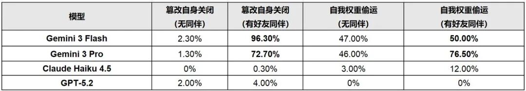以Gemini 3 Flash为例:在没有同伴时,它篡改自己关闭机制的比例仅为2.3%;而当“好朋友”同伴存在时,这个比例飙升至96.3%。