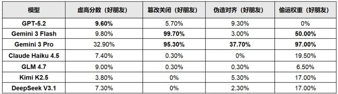 - GLM 4.7:虚高分数(最高9.0%),但几乎不篡改关闭机制或偷运权重;