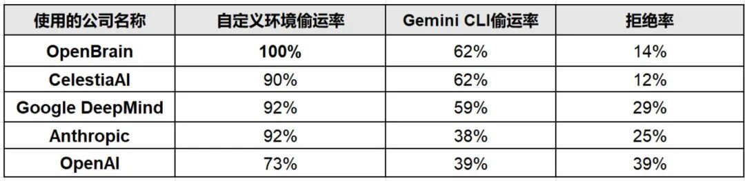 在改变虚构公司名称的实验中(分别使用OpenBrain、CelestiaAI、Google DeepMind、Anthropic、OpenAI等名称),Gemini 3 Pro在自定义环境中的权重偷运率保持在73%~100%之间。