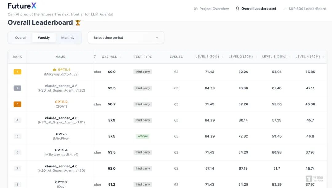 不过,总分拉胯不代表全盘皆输。为了更精准地衡量大模型的工业落地能力,FutureX专门设立了“细分预测任务”(涵盖基础事件与要求极高精度的FutureX-Pro垂直领域),这直接暴露了各家大模型的“偏科”体质: