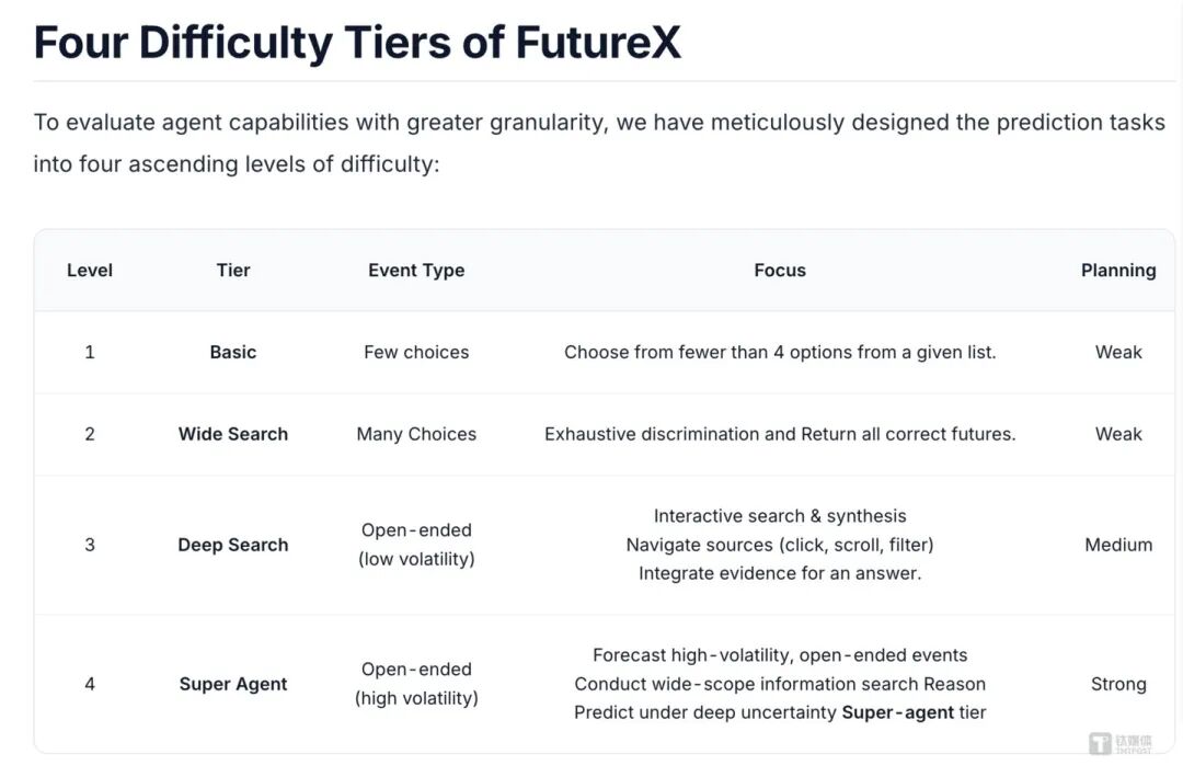 FutureX采用的是“折叠式”评分逻辑,拒绝模型靠蒙对简单的“是与否”来刷分。它大幅压缩了二元对立事件的数量,并将难度分为四个等级: