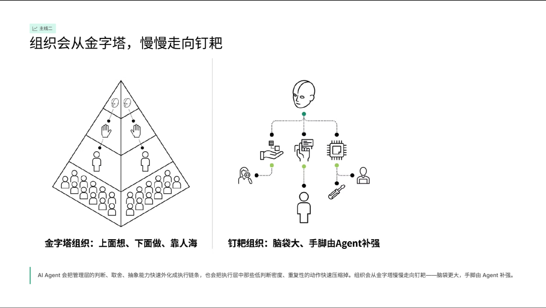 这种反常规的“眼高手低”者能力大幅加强会带来组织形态的变化。过去是金字塔:少数人想,多数人执行。往后会变成一种我叫做“钉耙型组织”的形态——脑袋变大,手脚被Agent承接。真正值钱的,是能想清楚方向、能设计系统、能判断什么时候信AI什么时候不信的人。