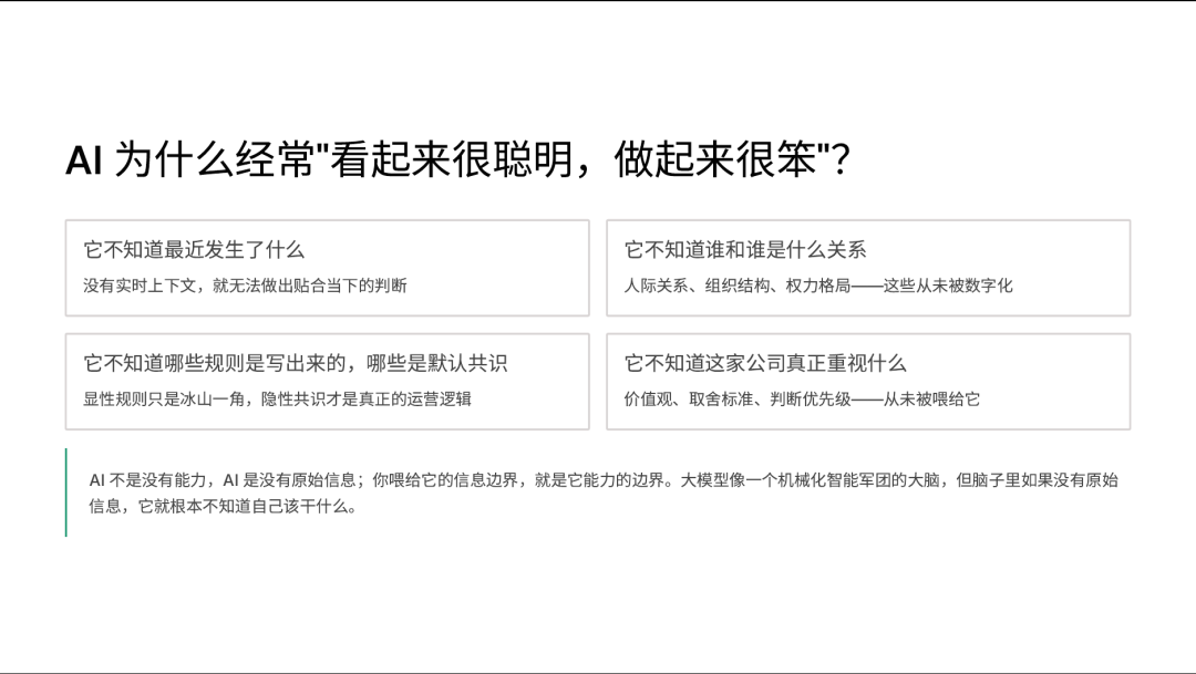 它需要知道:这家公司最近在讨论什么方向?上周会议谁说了哪句话改变了决策?这个客户和谁的关系好?那个约定俗成但从来没写进文档的规矩到底是什么?这家公司的三观和方法论——碰到争议时怎么判断?