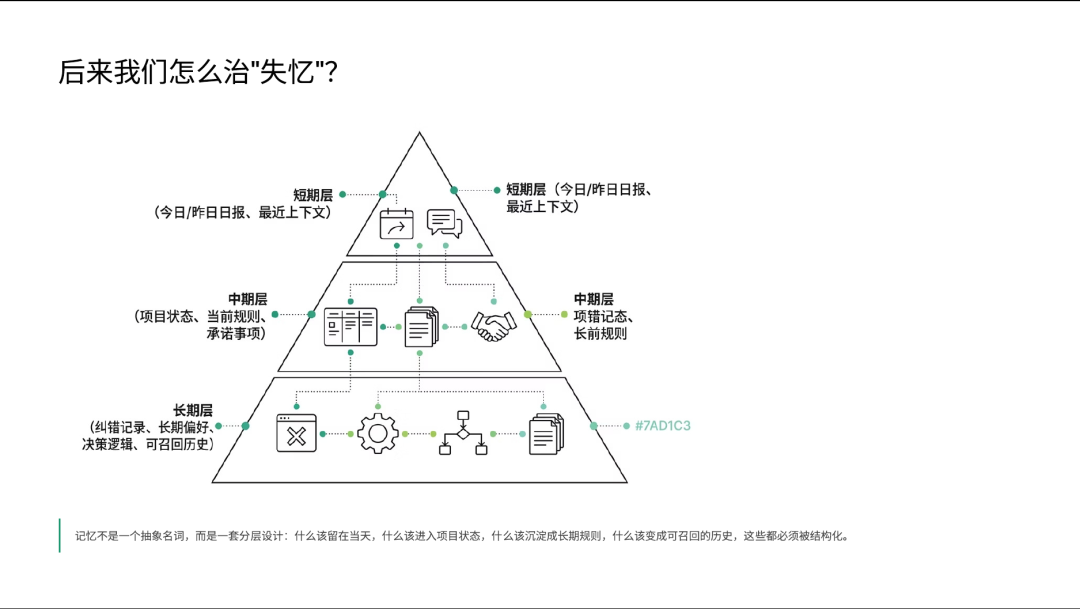 三层记忆体系:日报层→规则层→历史召回层,协作成本越来越低