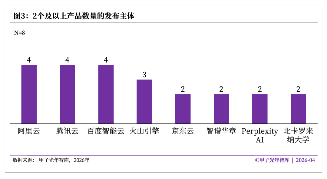 从2个及以上产品数量的发布主体看,阿里云、腾讯云、百度智能云均以4款产品并列市场头部梯队,火山引擎紧随其后,京东云、智谱华章、Perplexity AI以及北卡罗来纳大学均有两款产品。整体而言,AI云大厂在产品数量持有上占绝对优势,平均持有产品数量超过3个。