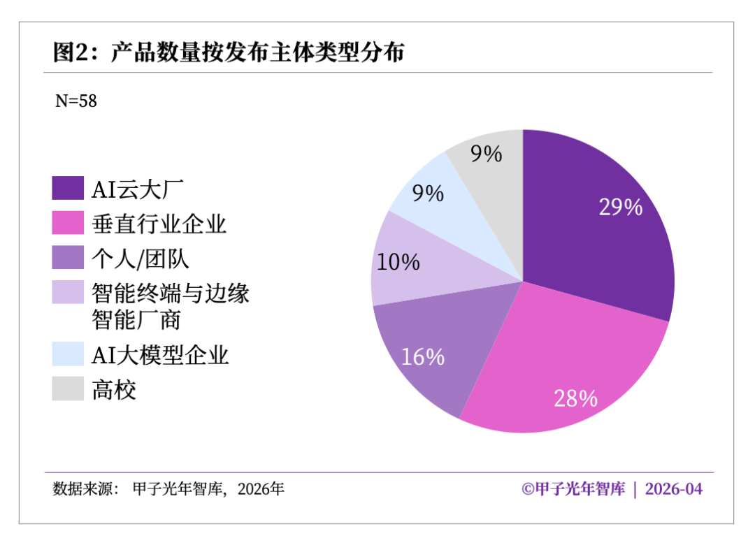 AI云大厂与垂直行业企业的产品数量占比为57%,是市场的主导力量,但AI云大厂与垂直行业企业几乎持平,垂直行业的场景化渗透能力较强,AI云大厂的平台优势尚未形成压倒性壁垒。