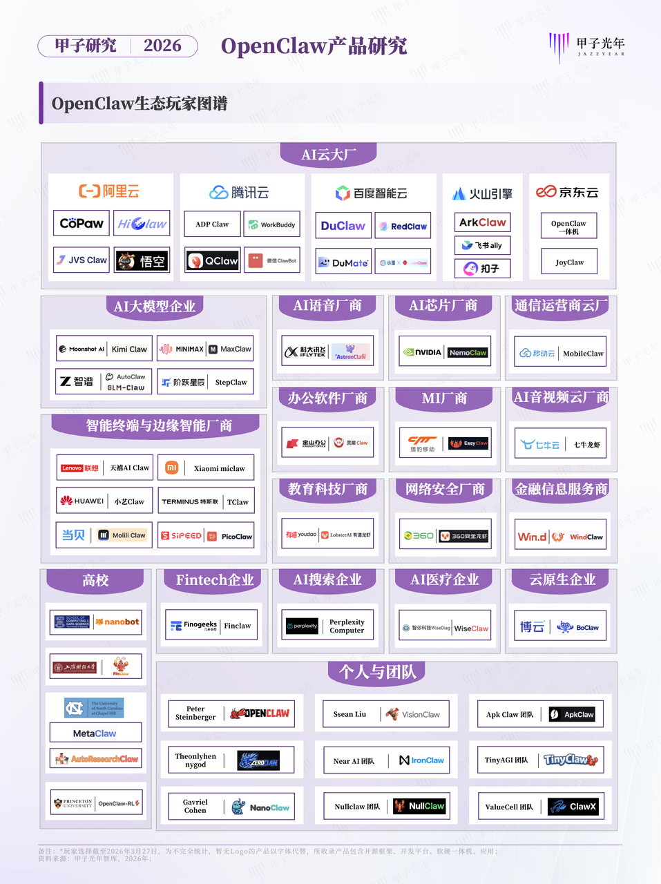 截至2026年3月27日,甲子智库共统计58个OpenClaw形态类产品,产品数量在统计时间内呈现出爆发式增长,发布主体以AI云大厂与垂直行业企业为主,产品以多模型支持为主,2C场景率先渗透,成为当前落地探索的主要方向。