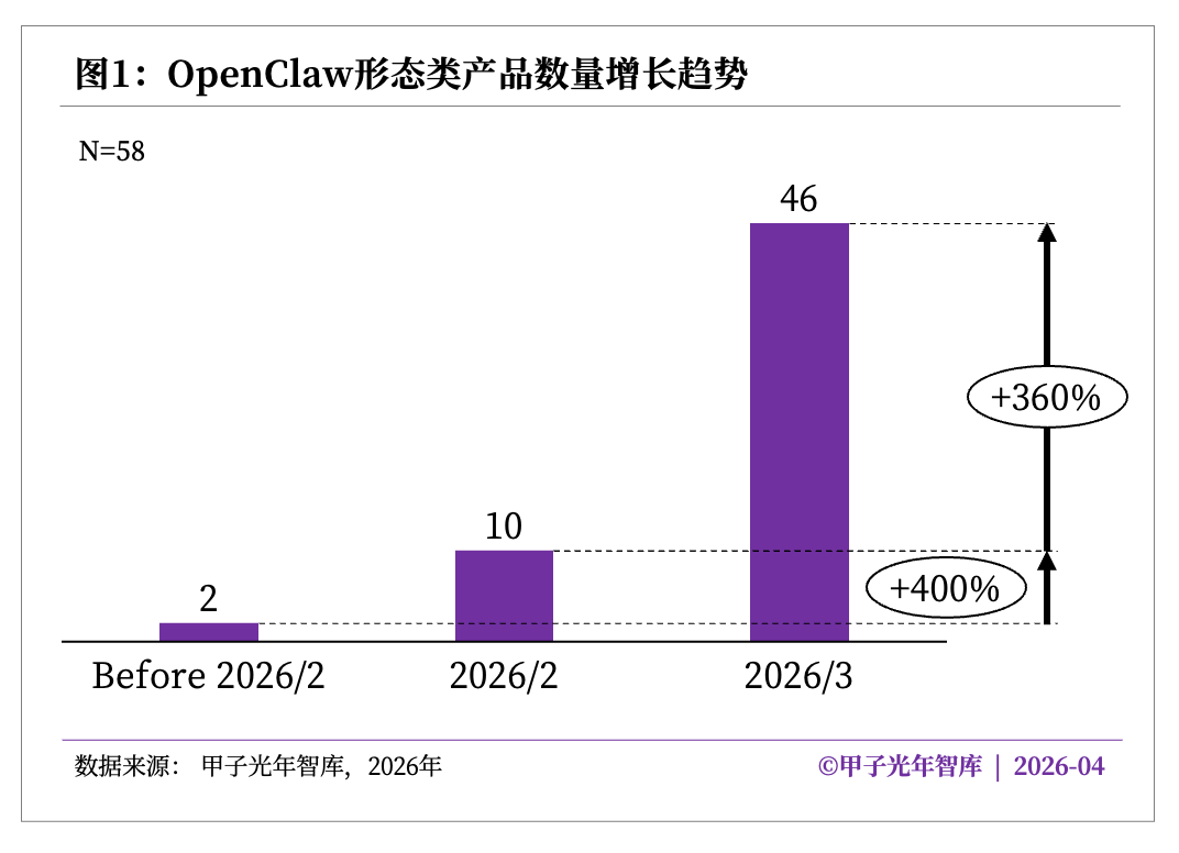 2026年2月,随着OpenClaw在开发者圈中持续发酵,市场情绪迅速升温,产品数量增至10款,相比2026年2月之前增长400%,增长势头出现。