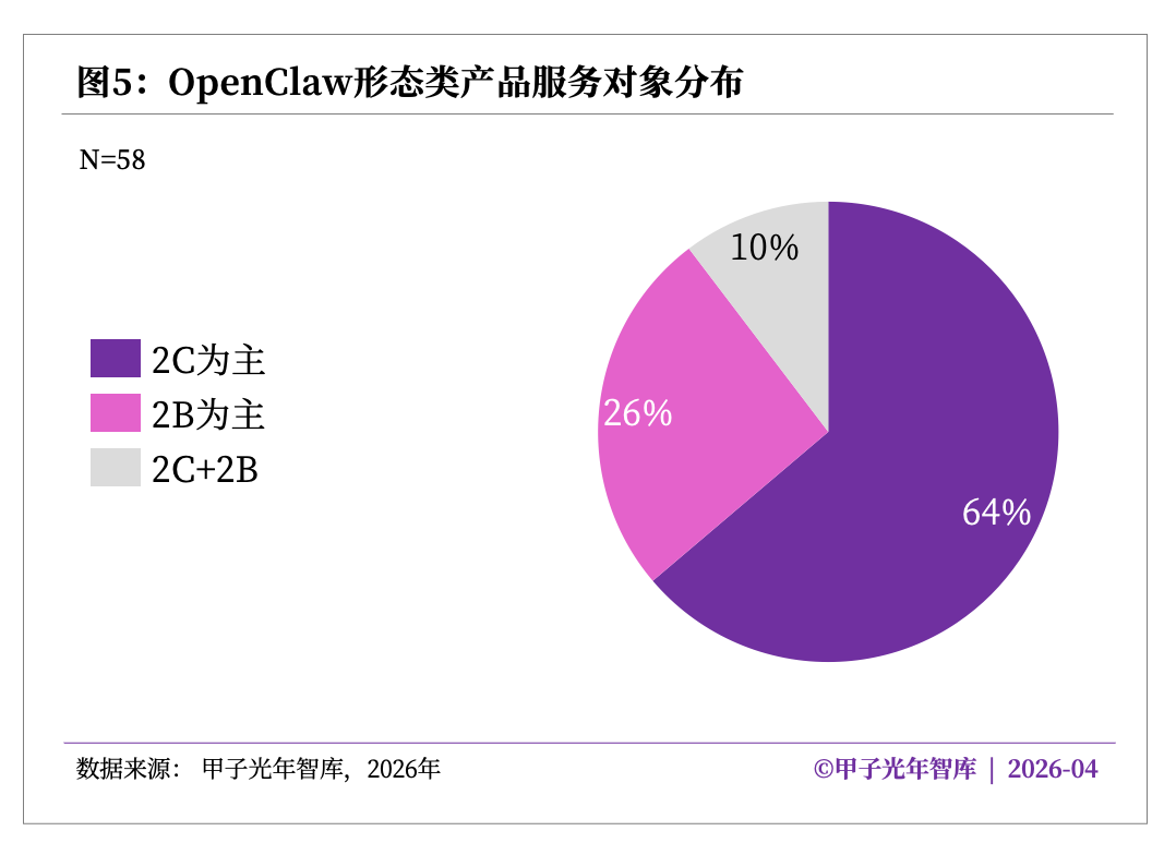 64%的产品以C端用户为主要服务对象,2B产品仅占26%。这个比例类似大模型当初先走一遍的路径——C端验证成本低,试错空间大,产品迭代速度快,更易开展产品公测与落地。因此,OpenClaw形态产品目前仍以个人效率工具为主要切入点。