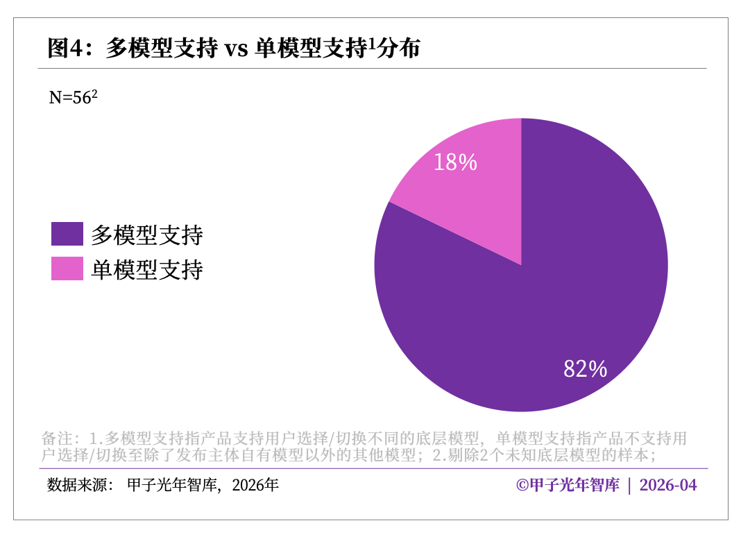 82%的产品支持多模型切换,仅18%绑定单一模型。单模型产品以AI大模型企业为典型,将产品作为自家模型能力的直接载体,将产品能力与自家模型深度绑定,为模型的商业化落地做市场验证,同时强化用户对模型品牌的认知与心智。