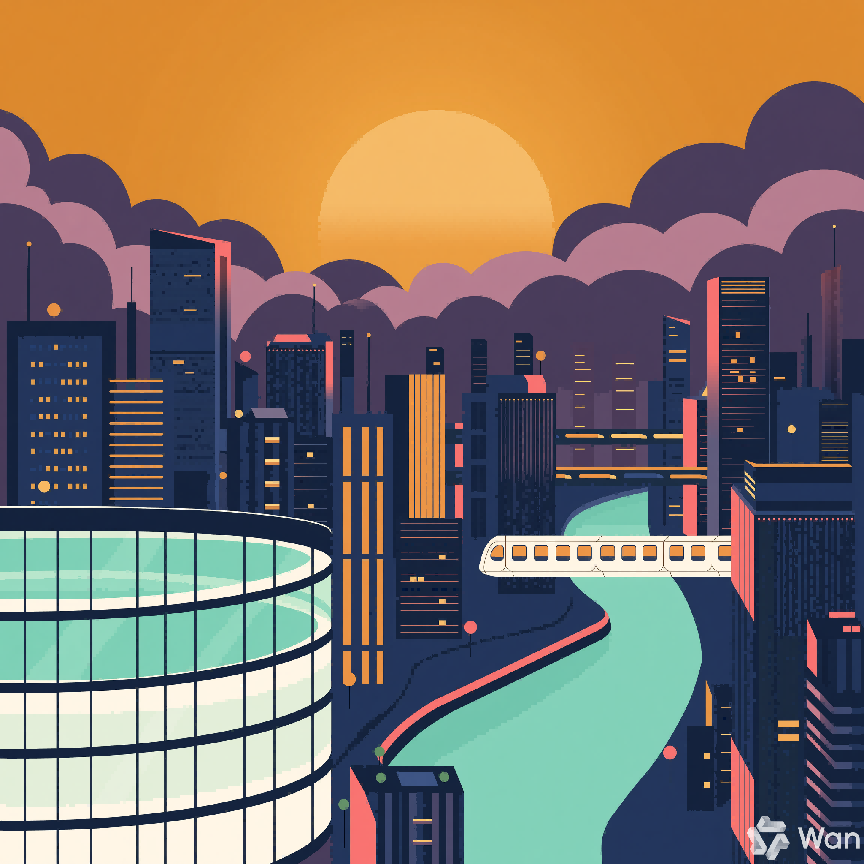 输入提示词:一幅扁平插画风格的未来城市俯瞰图,黄昏时分,画面中包含以下元素:近景是一座玻璃幕墙的弧形空中花园,中景是密集的高低错落建筑群和悬浮轨道列车,远景是层叠的云层与一轮巨大的落日。地面有河流穿城而过,河面倒映建筑灯光。画面整体色彩严格遵循调色盘配色方案,不要出现配色方案之外的大面积色块。