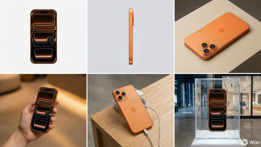 我们上传了一张iPhone 17 Pro的产品图,要求模型生成6宫格宣传图:正面、侧面、俯视、手持展示、桌面陈列、门店橱窗。关键约束是“主体造型、材质、颜色、比例一致,只改变机位和场景,不允许每张都像不同产品”。